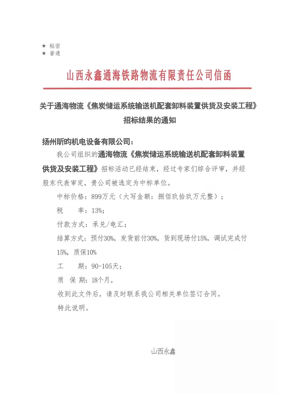 | 熱烈慶祝揚(yáng)州昕昀機(jī)電設(shè)備有限公司喜中山西永鑫焦化卸料裝置(卸料車)標(biāo)段 | |